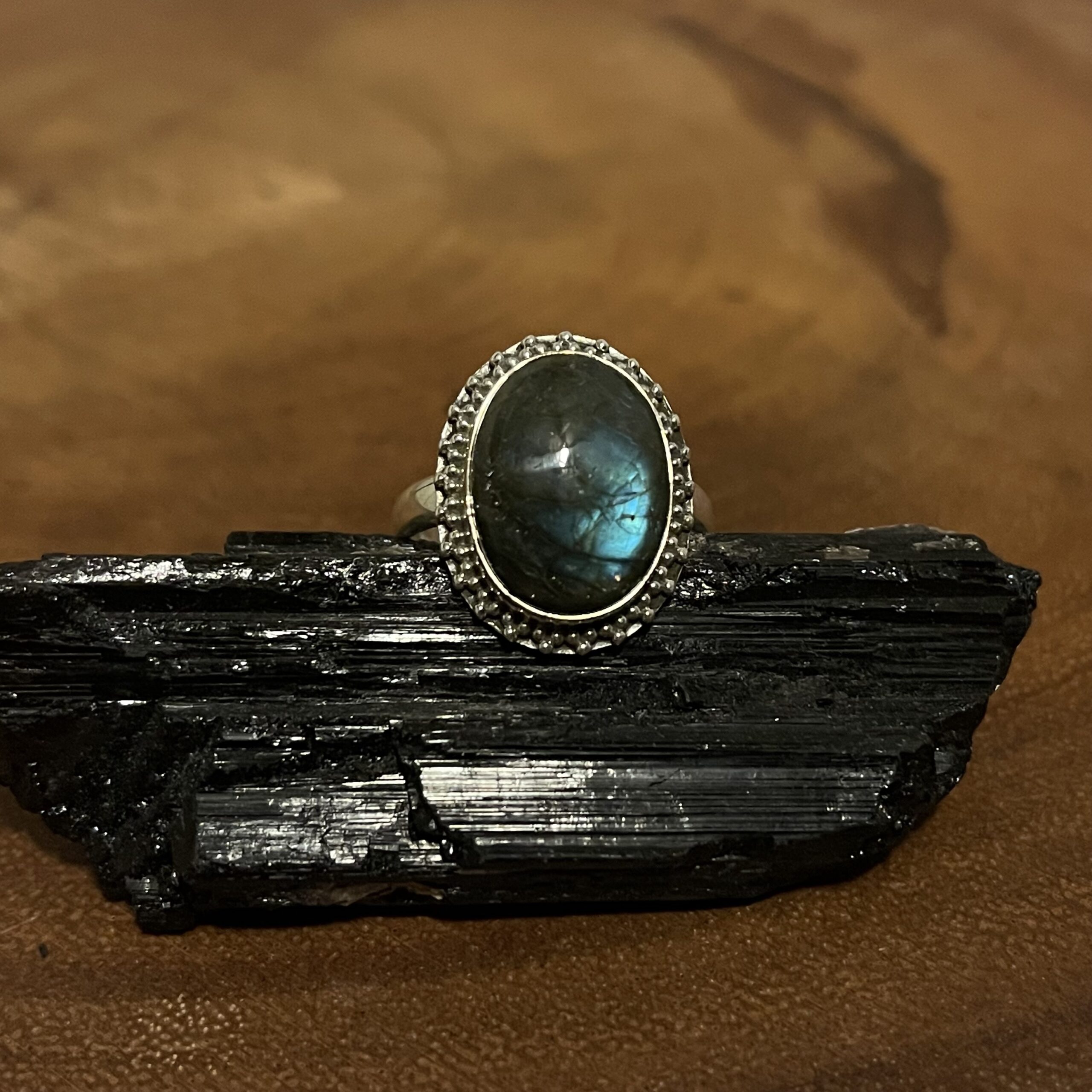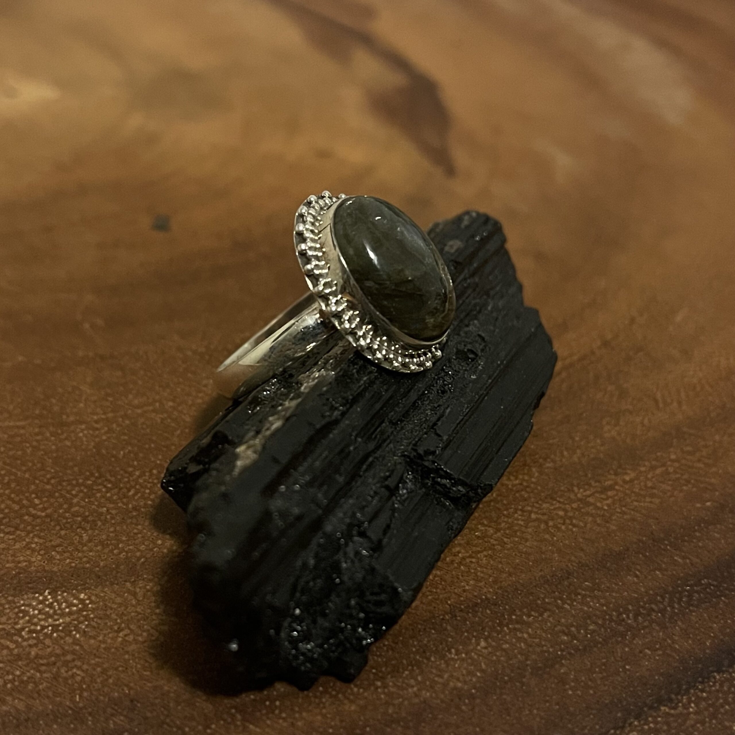The oval-shaped natural labradorite gemstone is perfect for one’s transformations in life! The gemstone creates a shield for auras and protects against the negativity of the world. Labradorite is said to temper the negativity within ourselves as well. Labradorite is also known for its changing colors, so no surprise that this gemstone is known for transformations, enhancing your strength of will and inner worth. The unique cut and lines around the bezel are beautifully elegant to the eye. The simple yet stylish size 9 band is made of solid 925 sterling silver.